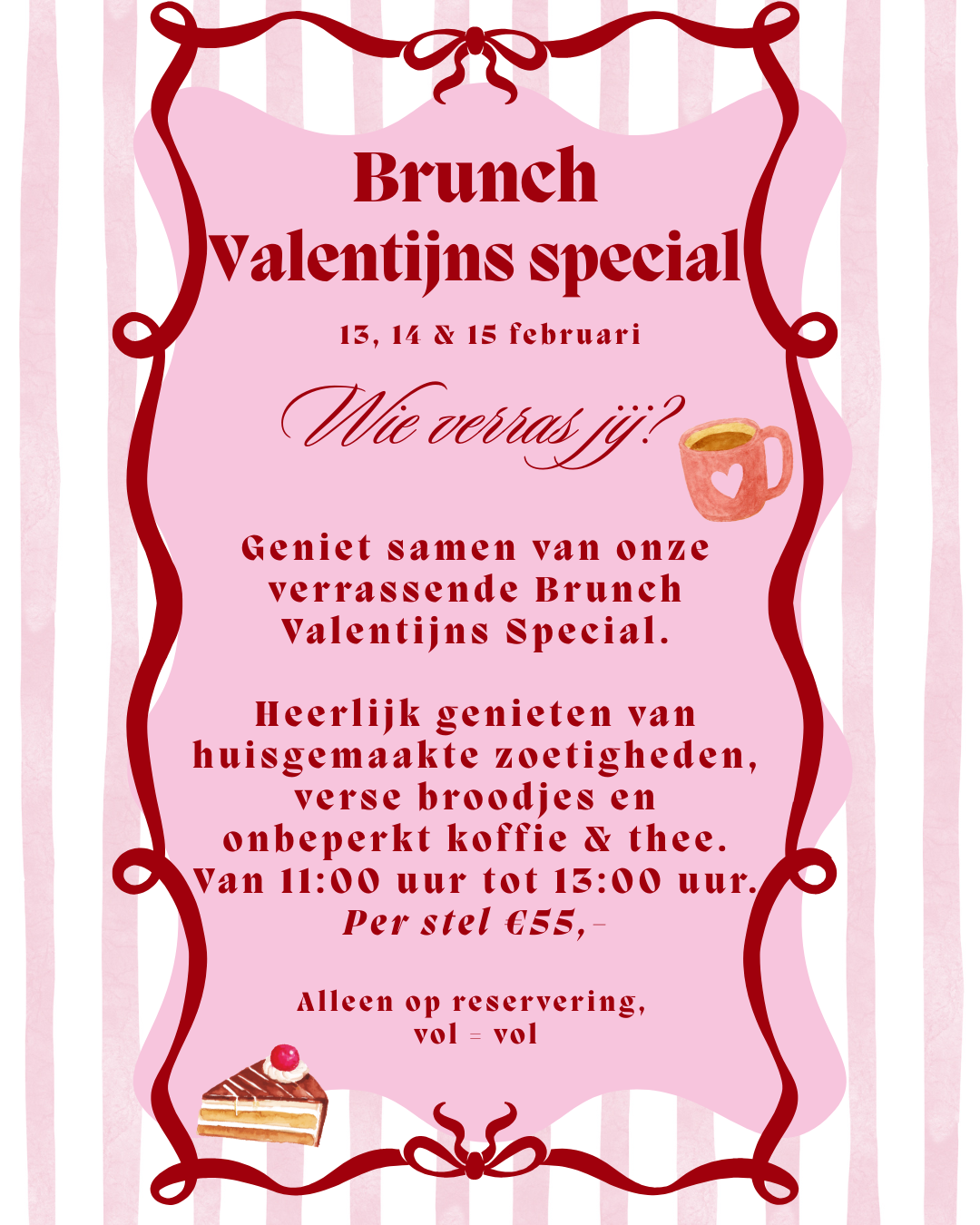 Met Valentijn hebben wij de winkel vol leuke kado’s liggen, maar er is ook een mogelijkheid om gezellig met jou Valentijn te genieten van onze Valentijns special. Zie de foto hiernaast. Reserveer snel & tot dan!